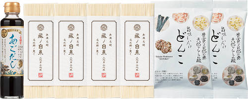 ●純手延べそうめん45g×16束、長崎県産のあごだしつゆ190ml×1、大分県産原木どんこ椎茸30g×2