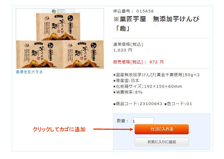 2.検索結果として商品が表示されたら個数を入力して「カゴに入れる」をクリックしてください。