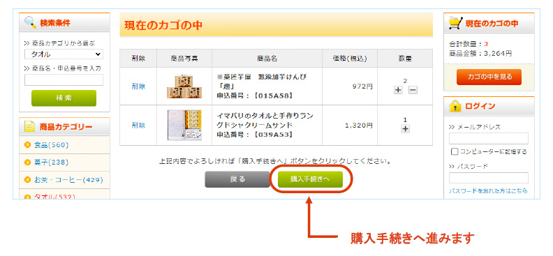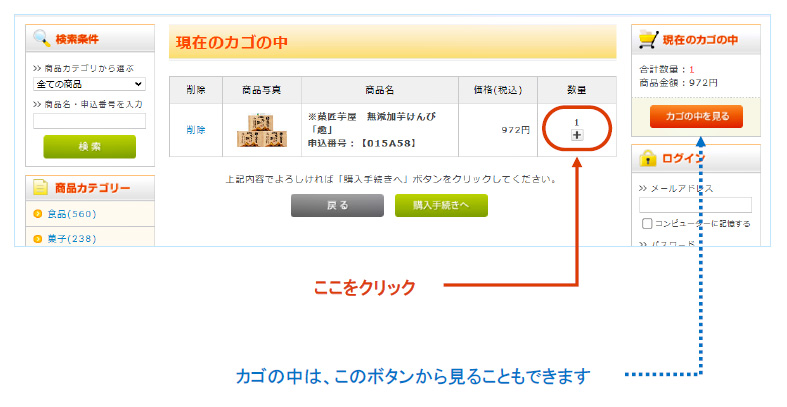 3.商品をカゴに入れると「現在のカゴの中」が表示されます。個数の変更・削除をこちらで行うこともできます