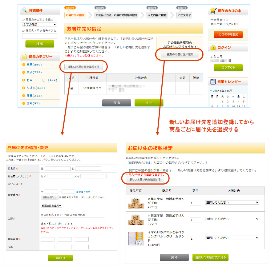 複数の商品がカゴに入っている場合、それぞれ複数のお届け先に送ることも可能です。