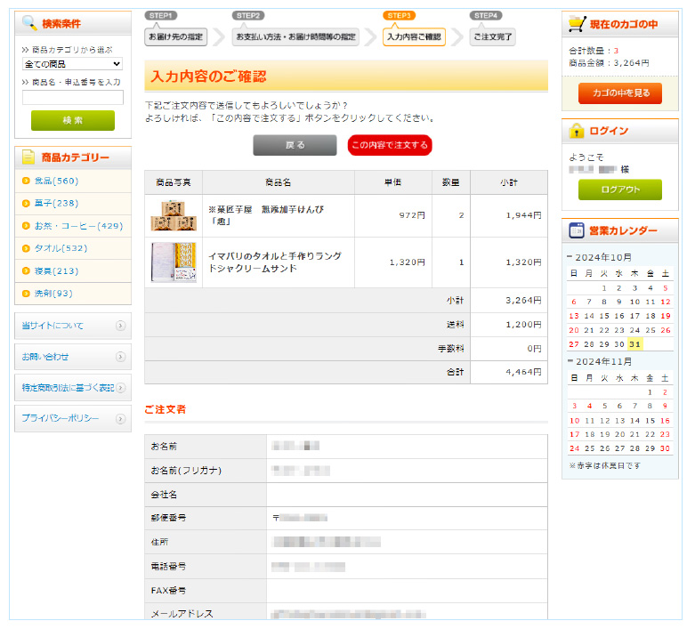 ご注文内容を確認する最後のページです。内容に相違がなければ「この内容で注文する」ボタンを一度だけ押してください。これでご注文完了となり、自動送信メールがお手元に届きます。